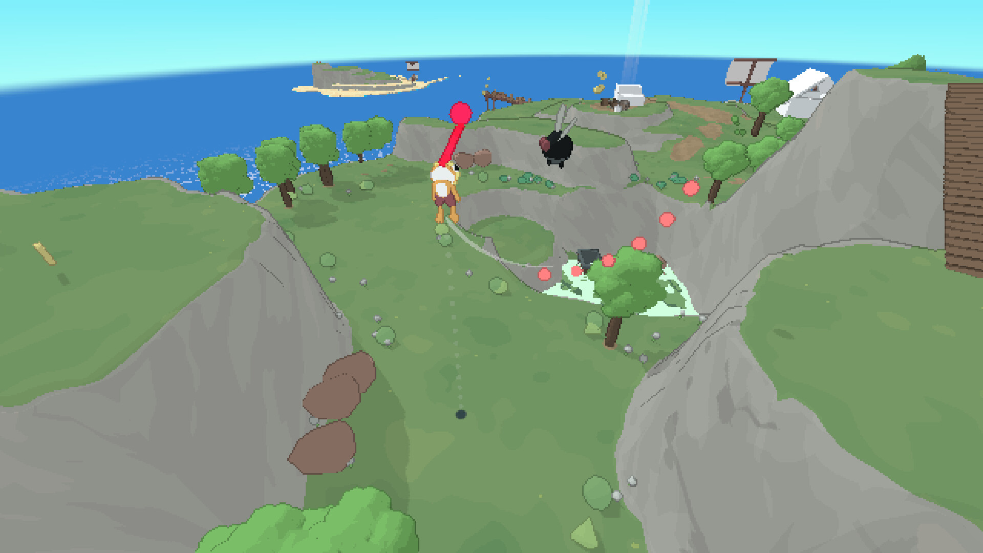 Collectibles and treasures are hidden all over the tiny island. Some require you to solve puzzles and riddles whereas others test your platforming abilities. As a reward, you can trade your riches for hats and outfits.