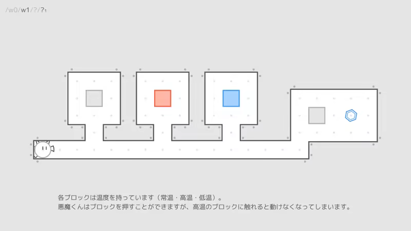 ブロックはを持っていて、熱かったり冷たかったりします。さすがの悪魔でも熱いのは苦手…… ですが、冷たいブロックをぶつければ熱を冷ますことができます。