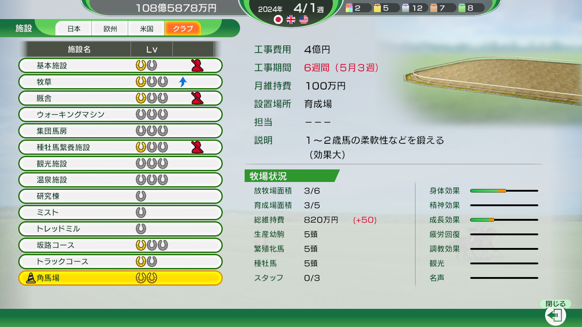 ②日本、米国、欧州のプレイヤー牧場およびクラブ牧場の施設の建設や拡張にかかる工事期間が通常の半分になり、より早く施設を建設できるようになります