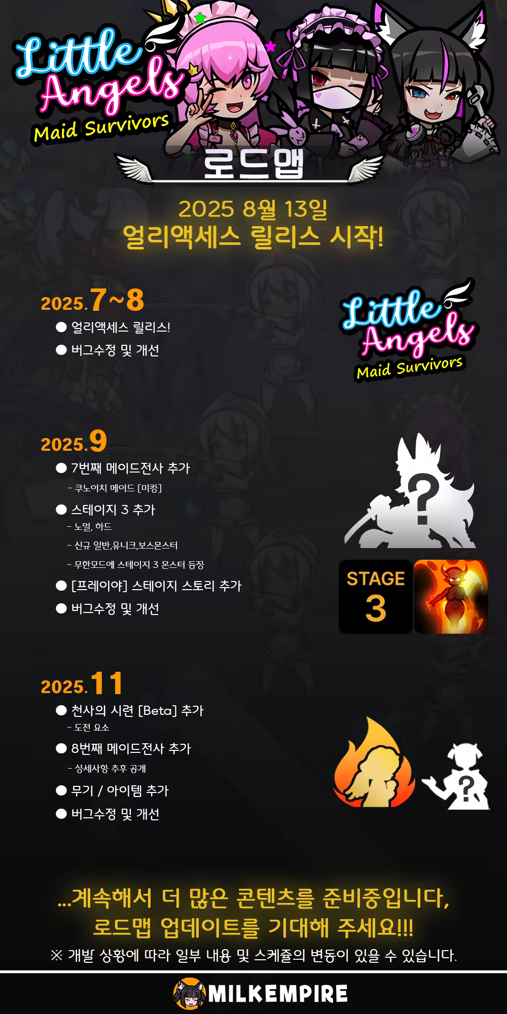 [Maid Survivors : Little Angels] 은 다양한 매력의 메이드전사들이 몰려오는 적들과 강력한 보스에 맞서 싸우는 로그라이트 아레나 슈팅 게임입니다. 메이드전사를 강화하고, 다양한 무기와 아이템중에서 선택하여 자신만의 빌드를 만들어 적들로부터 지구의 평화를 지켜내세요!