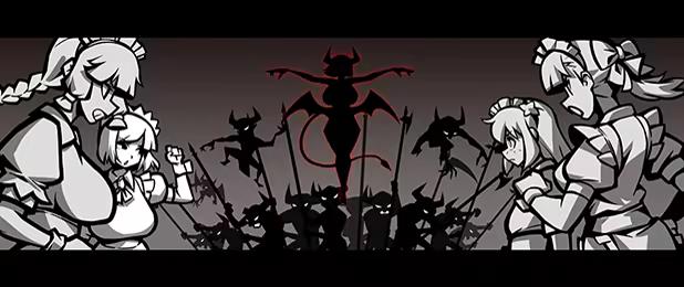 Little Angels contains veiled nudity, sexual themes, some strong languages. Player can see the character's partial costume damaged images when the characters got a heavy damages and when the fails a stage.