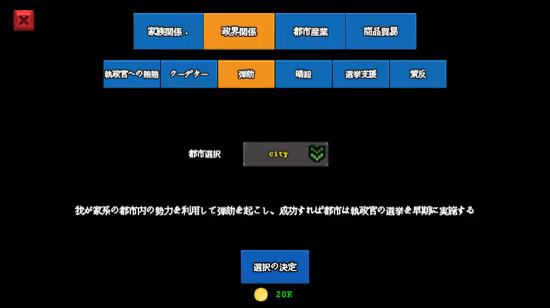 5、あなたは一族の勢力を動員して以下の行動を取ることができます:一族同盟、一族の復讐、一族戦争、内通者の摘発、スパイの派遣、一族の和解、執政官への賄賂、クーデター、弾劾、暗殺、選挙支援、離反工作、領土奪取、強盗、物価操作、武器密輸、人身売買、輸出入交渉。