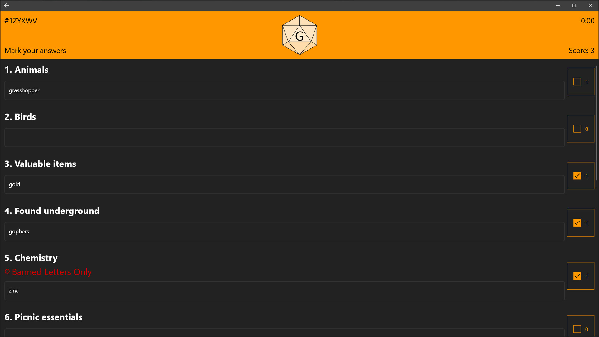 The word-based, multiplayer, party game that doesn't require internet! 😺🎲 Play with your friends on different devices; you can play together in the same room or communicate using VoIP! The game features endlessly generating, live rounds that have different topics, modifiers, and letters!