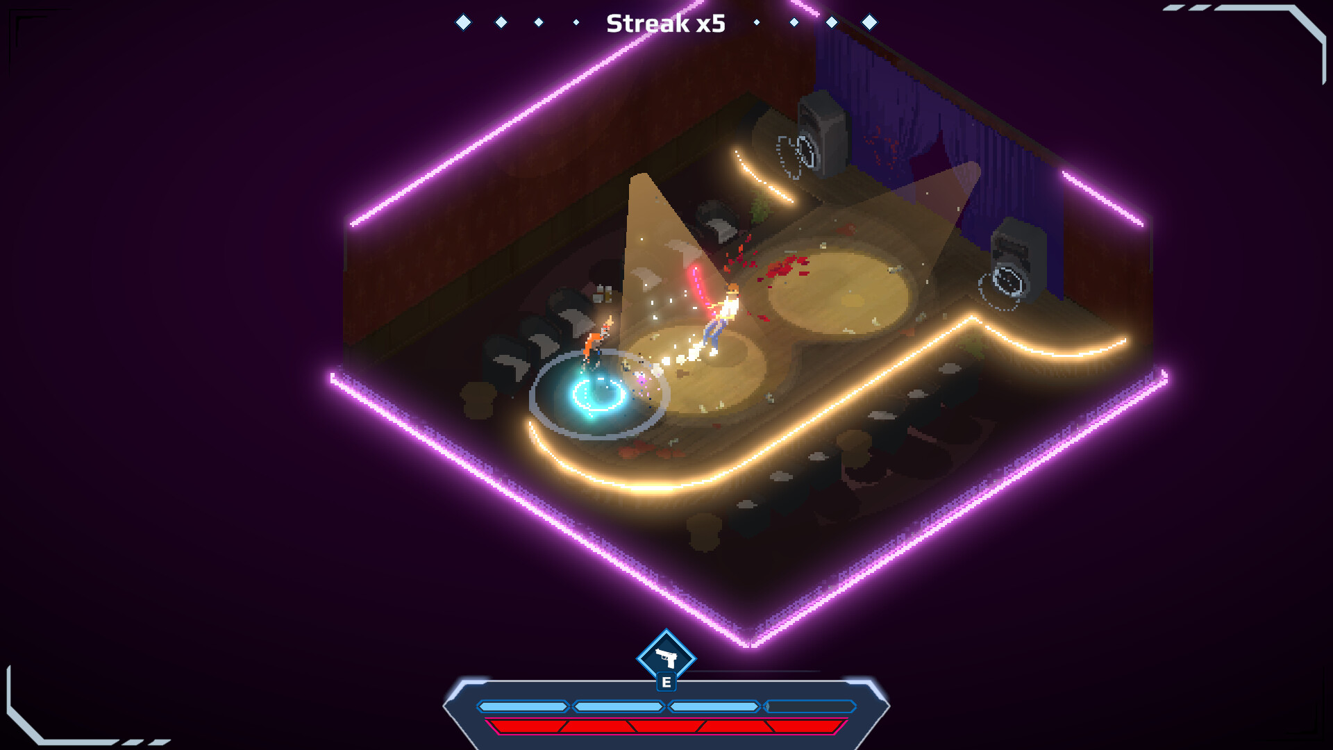 Disco Samurai ist ein einzigartiges Rhythmus-Kampfspiel in einem Cyberpunk-Setting. Kombiniere Angriffe, Paraden, Sprints und andere Fähigkeiten im Takt der elektronischen Musik. Dreh die Lautstärke auf und tauche ein in die elektrisierende Klanglandschaft von Synthwave und Rock!