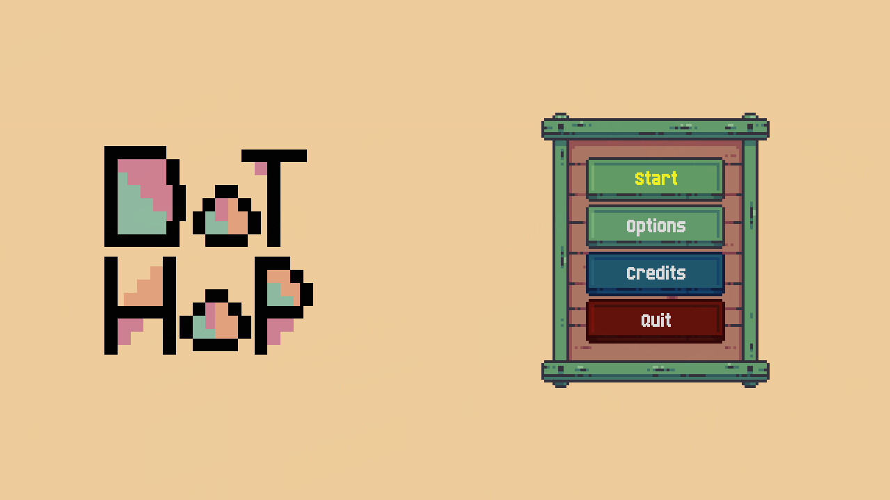 Dot Hop's main menu. Buttons read: Start, Options, Puzzles, Gym, Credits, Quit.