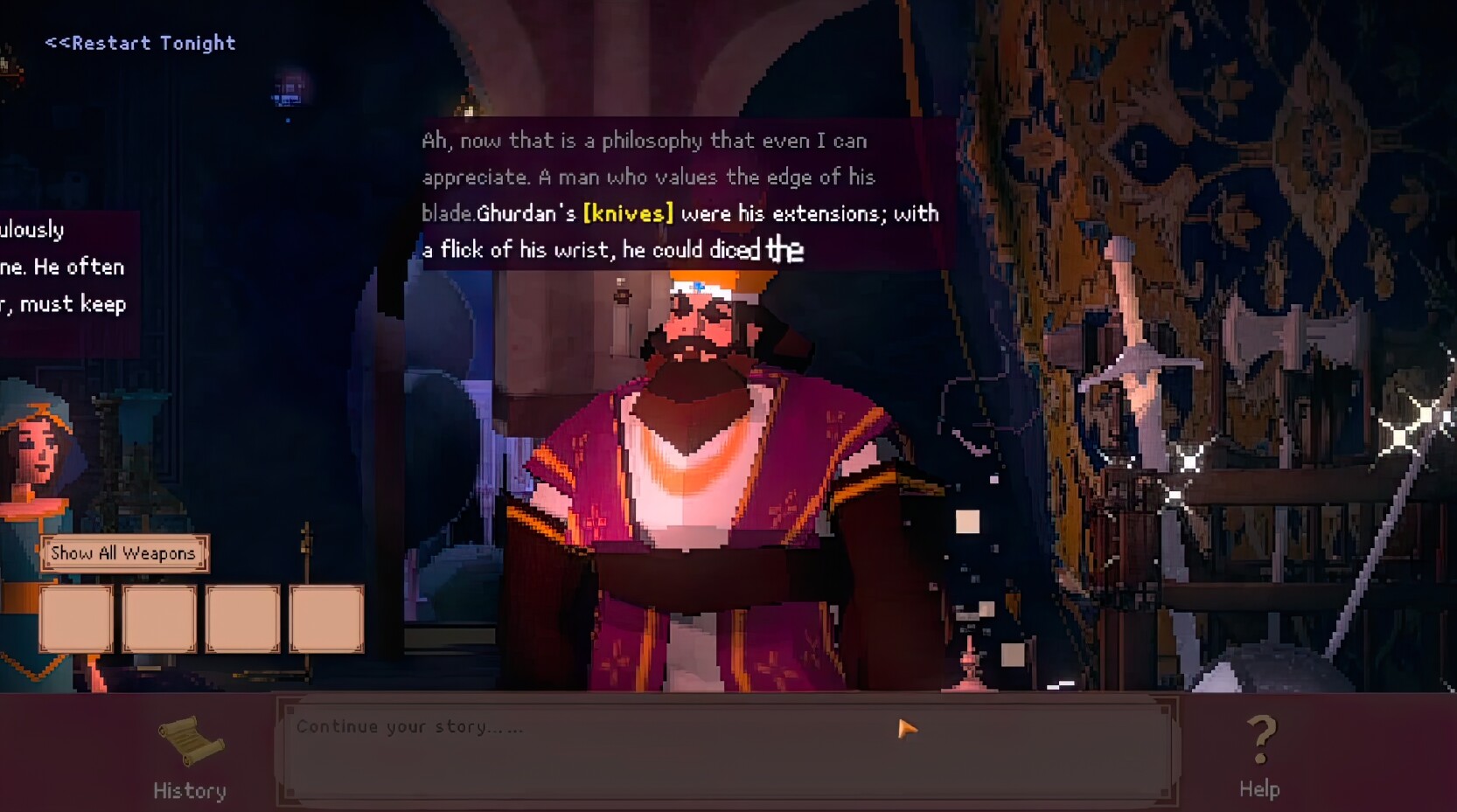Unleash your imagination! Tell captivating tales to intrigue the merciless King through typing. Cleverly guide him to mention words like 'sword', 'knife', or 'shield' in his responses - watch as they magically materialize into real weapons!