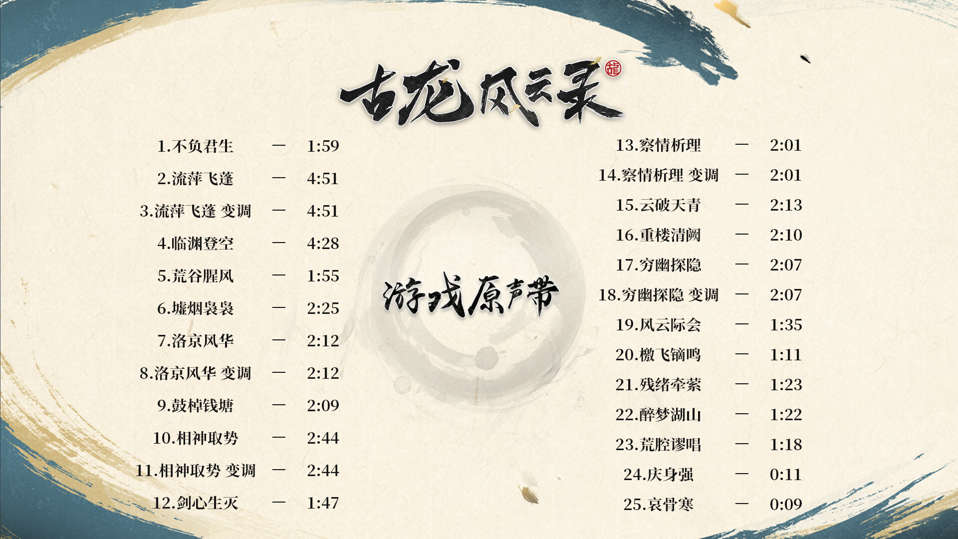 本原声带目前收录二十五首古龙风云录原创配乐,每首曲目皆提供「mp3」与「无损wav」两种版本