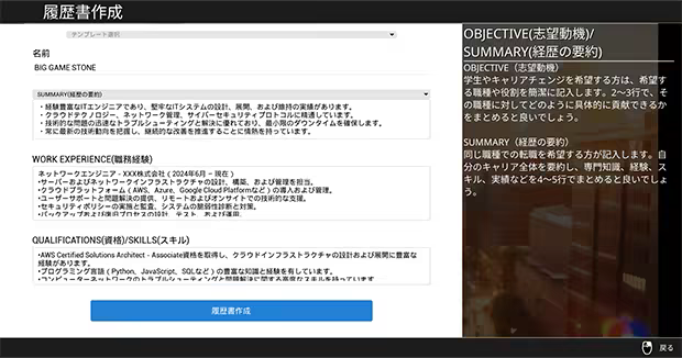 ゲーム内オリジナルの履歴書テンプレートを提供しています。ゲーム内で簡単に履歴書を作成します。自分のバックグラウンド、スキル、資格、そして個性を反映したオリジナルな履歴書をベースに面接官が質問して面接を進行します。