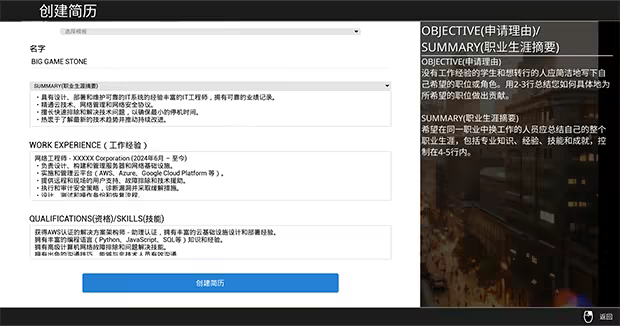 游戏提供了一个原创的简历模板。你可以在游戏中轻松制作简历。面试官将根据你的独特简历,反映你的背景、技能、资格和个性,进行提问并推进面试。虽然简历的格式和设计因国家而异,但本游戏采用的是美国常用的格式和设计。