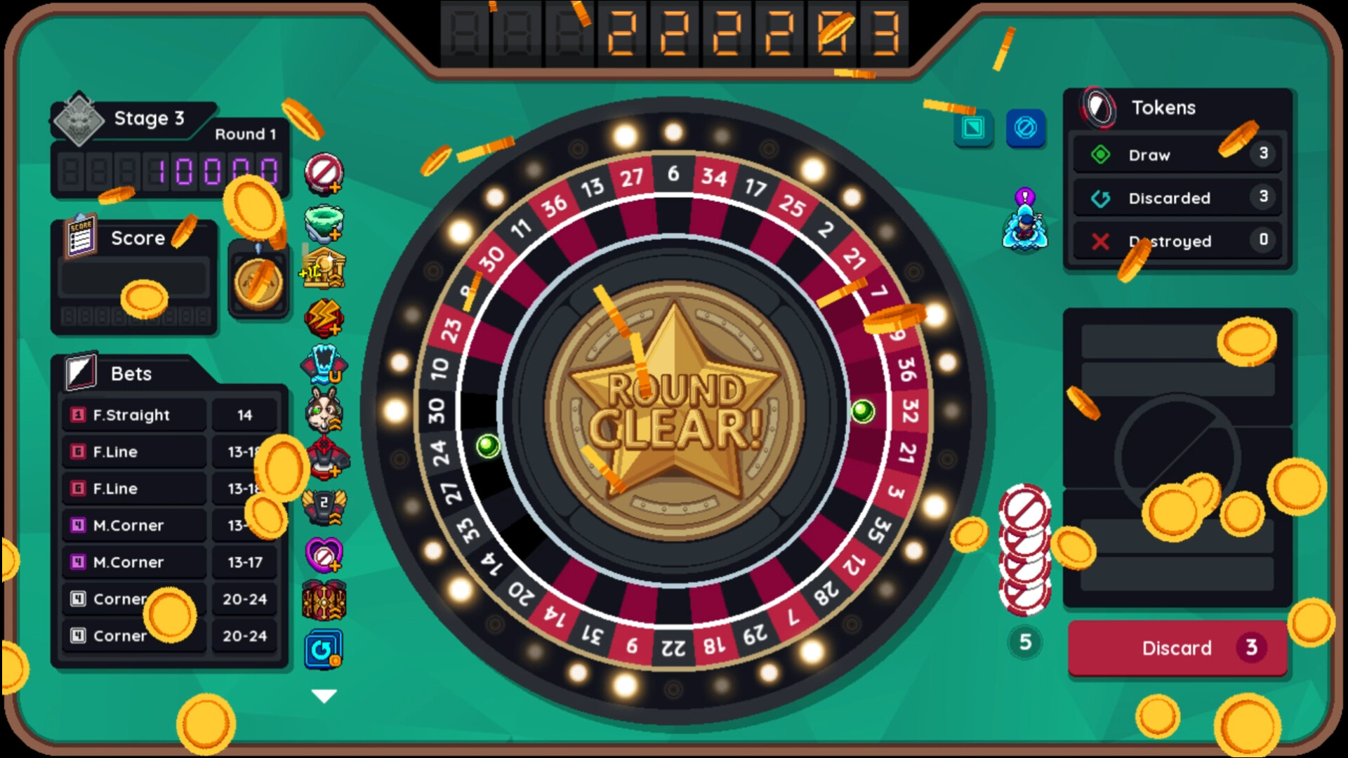 Bingle Bingle is a "Roulette Building" game where you can build your own roulette, changing numbers and colors to fit your strategy. You will start with a Normal Roulette and just a simple ball and bet. But as you spin the ball and earn scores to clear rounds, you will have the opportunity to upgrade your roulette, ball, and bets while crafting your own strategy. The decisions you make after each round to enhance your deck can lead to adrenaline-pumping synergy, where you can earn thousands or even millions of points, or you might fail and have to start all over again. Are you smart enough to create a strategy that will guide you to victory, and more importantly, are you lucky enough to beat the casino?