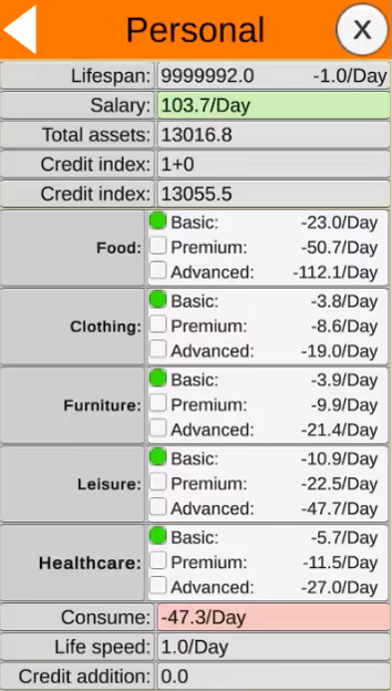 As an ordinary investor in the game, you have a job that just covers your basic living expenses. Daily expenses are inevitable, and budget control is crucial. Increasing consumption levels can reduce daily life consumption (extending your in-game lifespan) and boost your credit score. Your credit score, based on your total assets, enhances your purchasing power, allowing you to buy stocks on credit when your assets are insufficient.