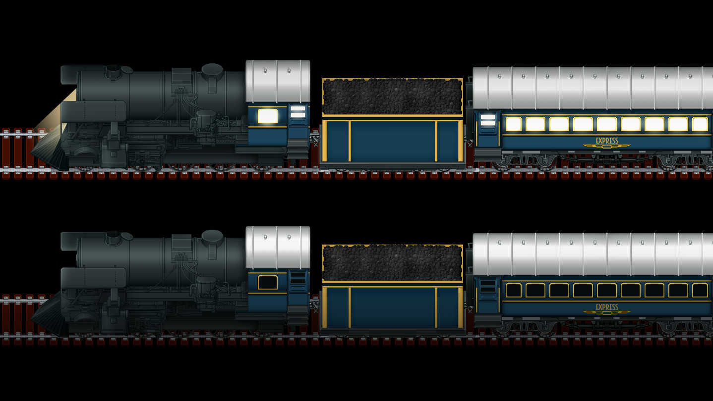 includes locomotive and passenger cars with night/day variations and door opening animations, and coal car (no lights or doors)