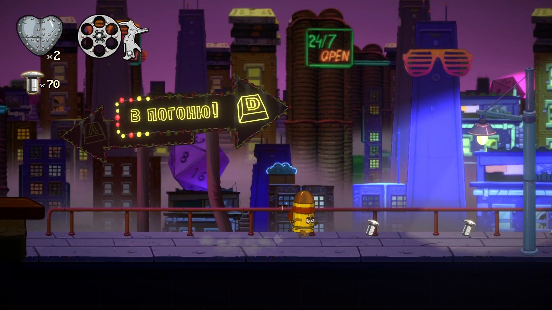 You are Bullet, outlawed by the City itself. The struggle you are in is nearly unwinnable, but it's not lonely: with Colonel Goose's help and his secret dream of fixing the City you stand a chance to achieve your goals and to bring back Freedom to your weaponized brothers. And today, this madman (or madgoose?) has decided to finally strike the leader of the local gang. Which can mean only one thing - it's up to you to save colonel's feathered ass! But are you ready to finally be who you really are? Are you ready, after so many years of living in shadows, to uncover your true nature? And are you able to face the truth of what the Weapon Ghetto holds?