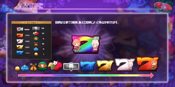 スロットの図柄をモチーフにしたマージパズル! リプレイ、ベル、スイカ……と順に大きくしていき、最後は虹7を出してライブボーナスに突入! 継続率約67%のライブループでガンガンスコアを稼いじゃおう!