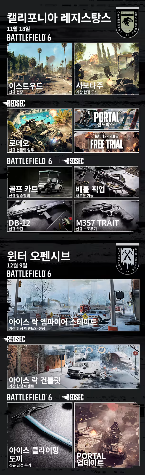 시즌 1은 먼저 로그 작전, 그다음 캘리포니아 레지스탕스, 겨울 공세의 3단계로 진행되며, 단계마다 테마에 맞는 기밀 군사품, 최첨단 보조장비, 신규 전장, 그리고 전에 없던 강력한 무기가 포함됩니다. 매달 새로운 콘텐츠가 추가되며, Portal에서 거의 무제한에 가까운 커스터마이징이 즉시 가능합니다.