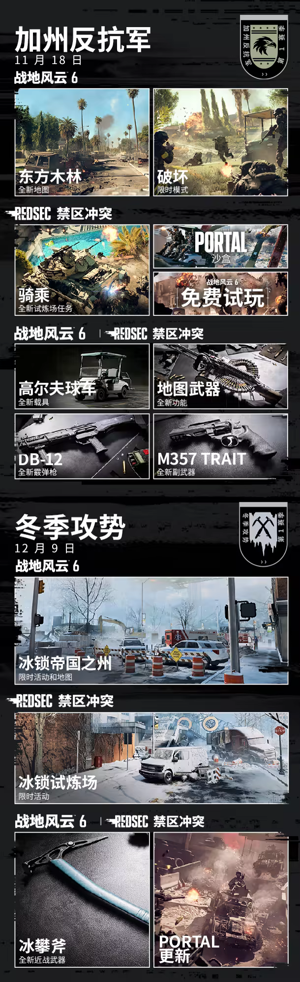 第 1 赛季分三个阶段推出:分别是“潜入行动”、“加州反抗军”和“冬季攻势”,每个阶段都包含主题化的机密军备、尖端配备、全新地图,以及威力非凡的武器。每个月都会加入新内容,并可立即在 Portal 中进行近乎无限的自定义。