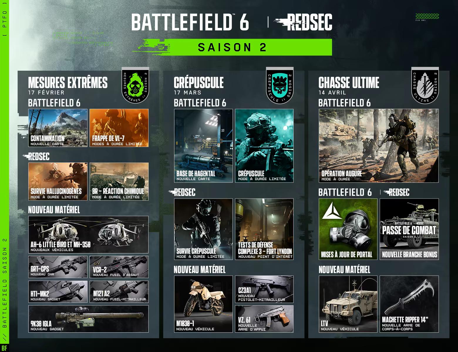 La guerre contre la Pax Armata traverse le globe et s'infiltre dans les montagnes d'Allemagne dans un assaut acharné pour reconquérir une base aérienne autrefois possédée par l'OTAN. La saison 2 sera disponible en 3 parties : Mesures extrêmes, Crépuscule et Chasse ultime, avec des cartes intenses, des gadgets essentiels, du nouveau matériel emblématique et des véhicules pour vivre l'expérience de guerre totale ultime. Plus tard, la saison 2 introduira le mode à durée limitée Opération Augure, où les enjeux sont élevés et la stratégie est cruciale, poussant les escouades à se rendre sur le front et assurer la victoire.
