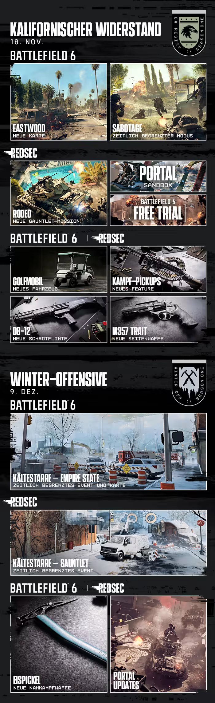 Season 1 kommt in 3 Phasen – Unautorisierte Operationen, dann Kalifornischer Widerstand und zuletzt Winter-Offensive – und alle bringen neue Gadgets, mehr Maps und Waffen, die dein Arsenal nur noch stärker machen. Jeden Monat fügen wir neue Inhalte hinzu, mit denen du in Portal noch mehr Anpassungsmöglichkeiten bekommst.