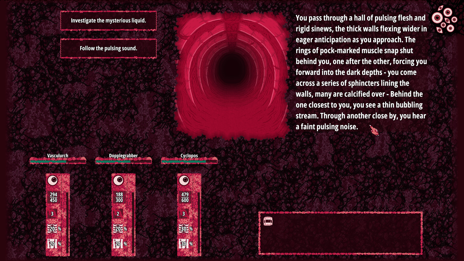 Siphonogore is a roguelike turn-based rpg mixed with a choose your own adventure game, where your choices and strategies matter.