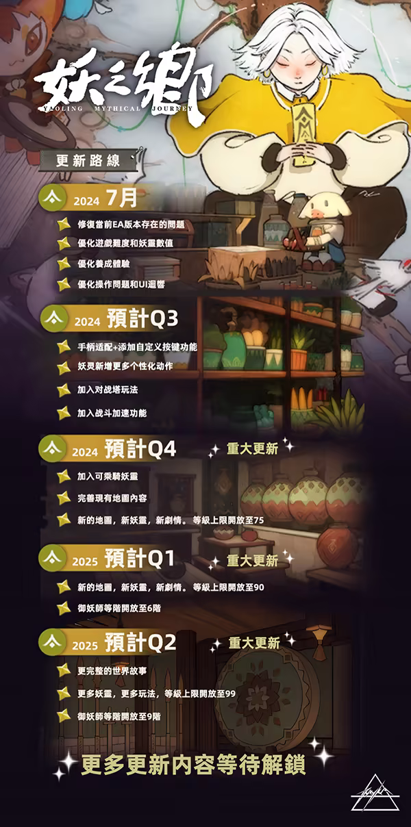 在命運的驅使下,你成為了禦妖師。你將與妖靈搭檔們一同遊歷四方,觀賞沿路風景、收集神秘寶物、挑戰各地宗門、擊退邪魔統帥。你也可以記錄更多妖靈的筆記,探索妖靈的陣容組合,或是在水邊釣魚——故事的開展,由你選擇。