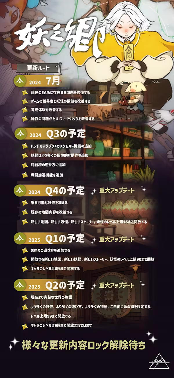 運命に導かれ、あなたは妖使いになりました。妖怪の仲間たちと一緒に四方を旅し、沿道の風景を楽しみ、神秘の宝物を集め、各地の宗門に挑戦し、邪妖統領を倒しましょう。ほかにも妖怪ノートを記録したり、妖怪のチーム編成を模索したり、水辺で釣りをしたり――どんな物語を展開するかは、あなた次第です。