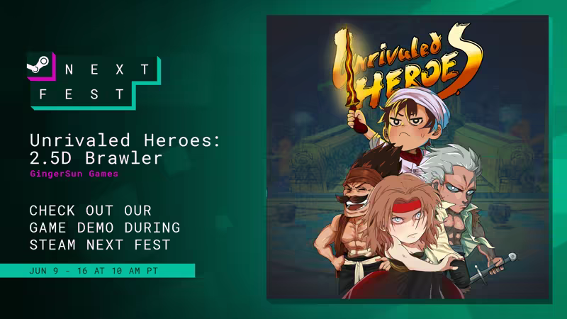 Singapura – 9 Juni 2025 – Bersiaplah berperang! GingerSun Games dengan bangga mengumumkan partisipasi Unrivaled Heroes: 2.5D Brawler dalam Steam Next Fest edisi Juni, yang akan digelar mulai 10 Juni hingga 17 Juni pukul 01.00 SGT.