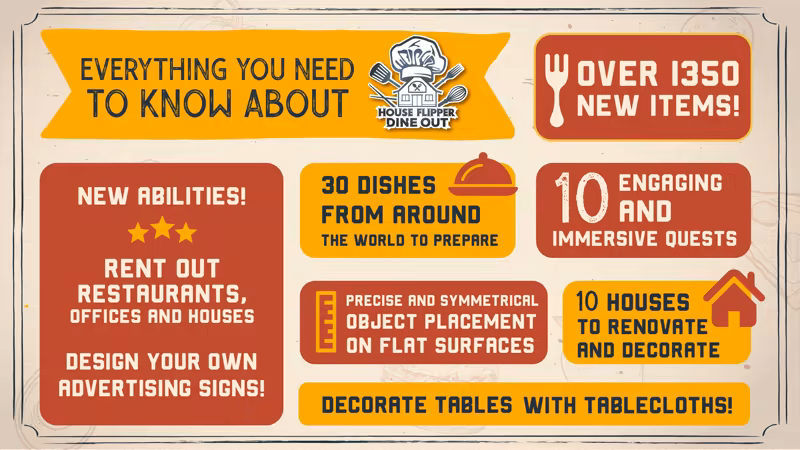 Dine Out DLC will let you get your foot in the door of the restaurant business. It comes with a set of engaging, immersive quests that will allow you to explore and renovate a variety of restaurants, cafes, sushi bars, wine cellars and pizzerias. The DLC also introduces numerous new items, mechanics and other features that will make your House Flipper experience more fun and comfortable.