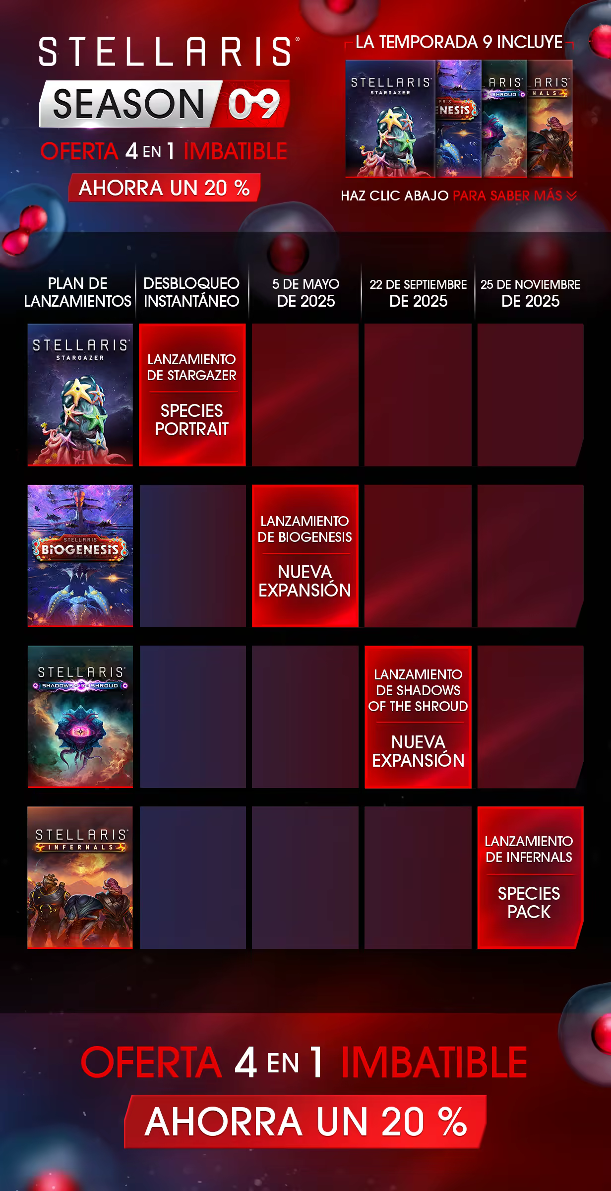 Incluye 5 artículos: Stellaris, Stellaris: Stargazer Species Portrait, Stellaris: BioGenesis, Stellaris: Shadows of the Shroud, Stellaris: Infernals Species Pack