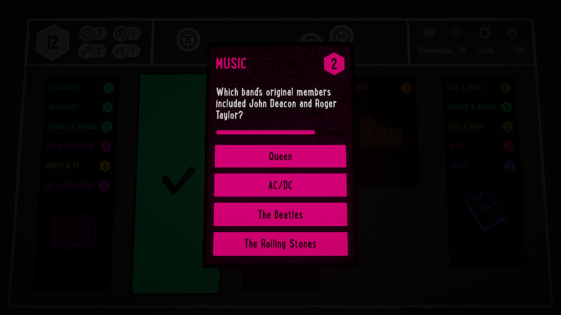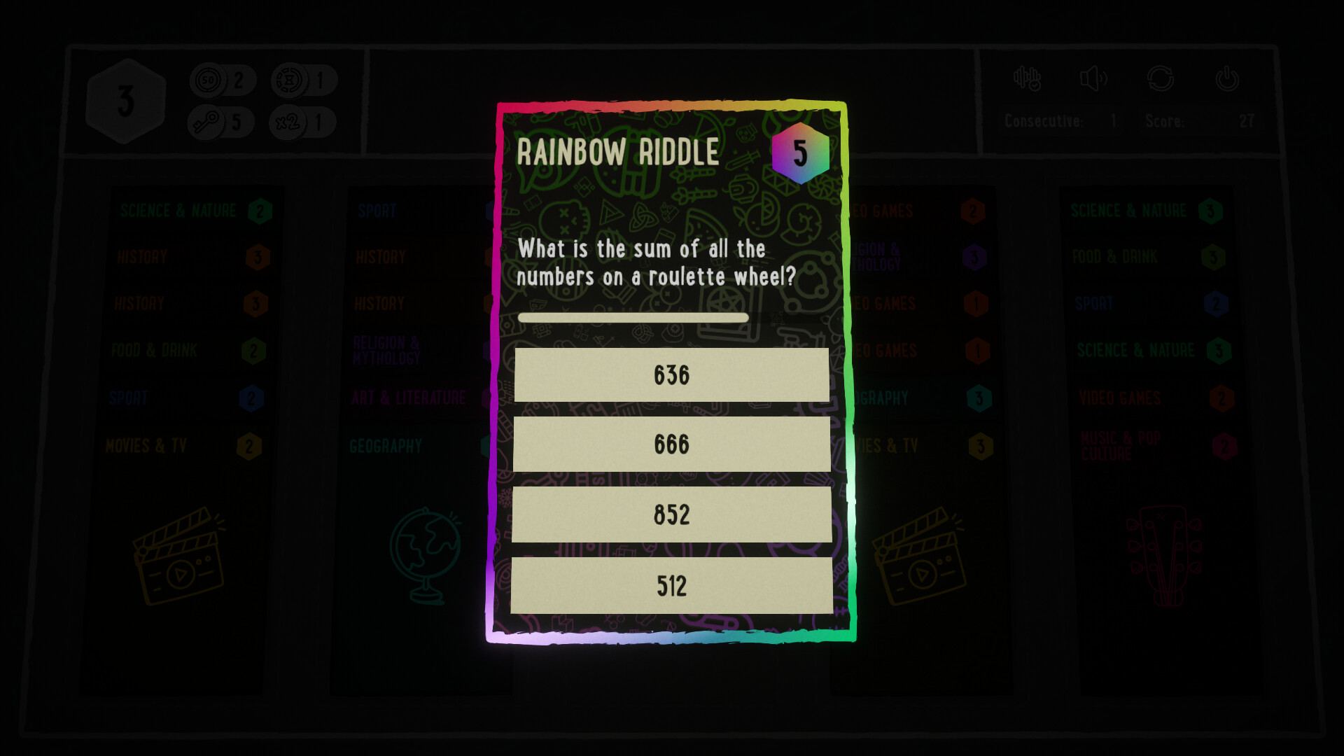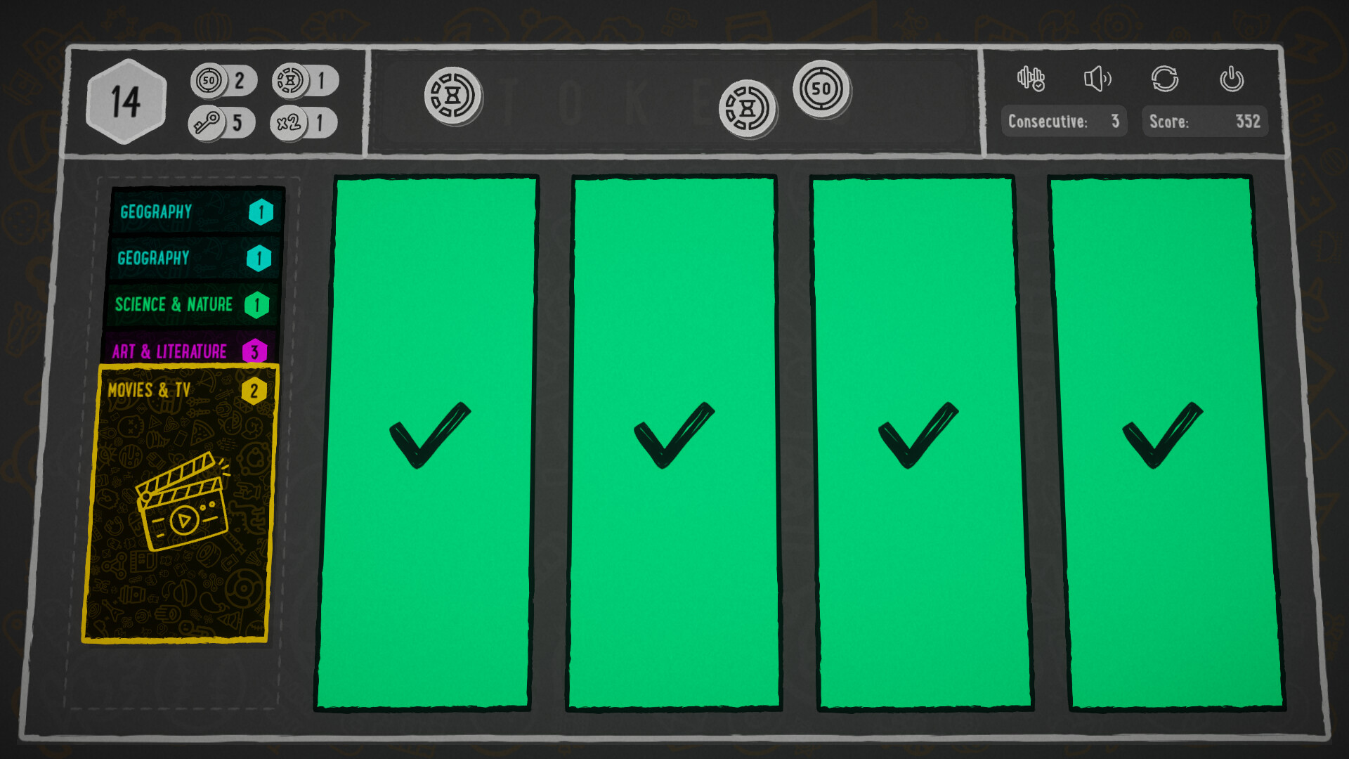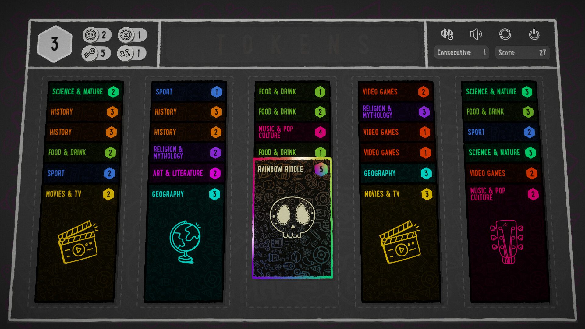 A challenging trivia card game with a randomly dealt deck each run. Test your knowledge by answering multiple choice questions of varying difficulty, earn tokens and use abilities to maximise your chances of conquering the board.
