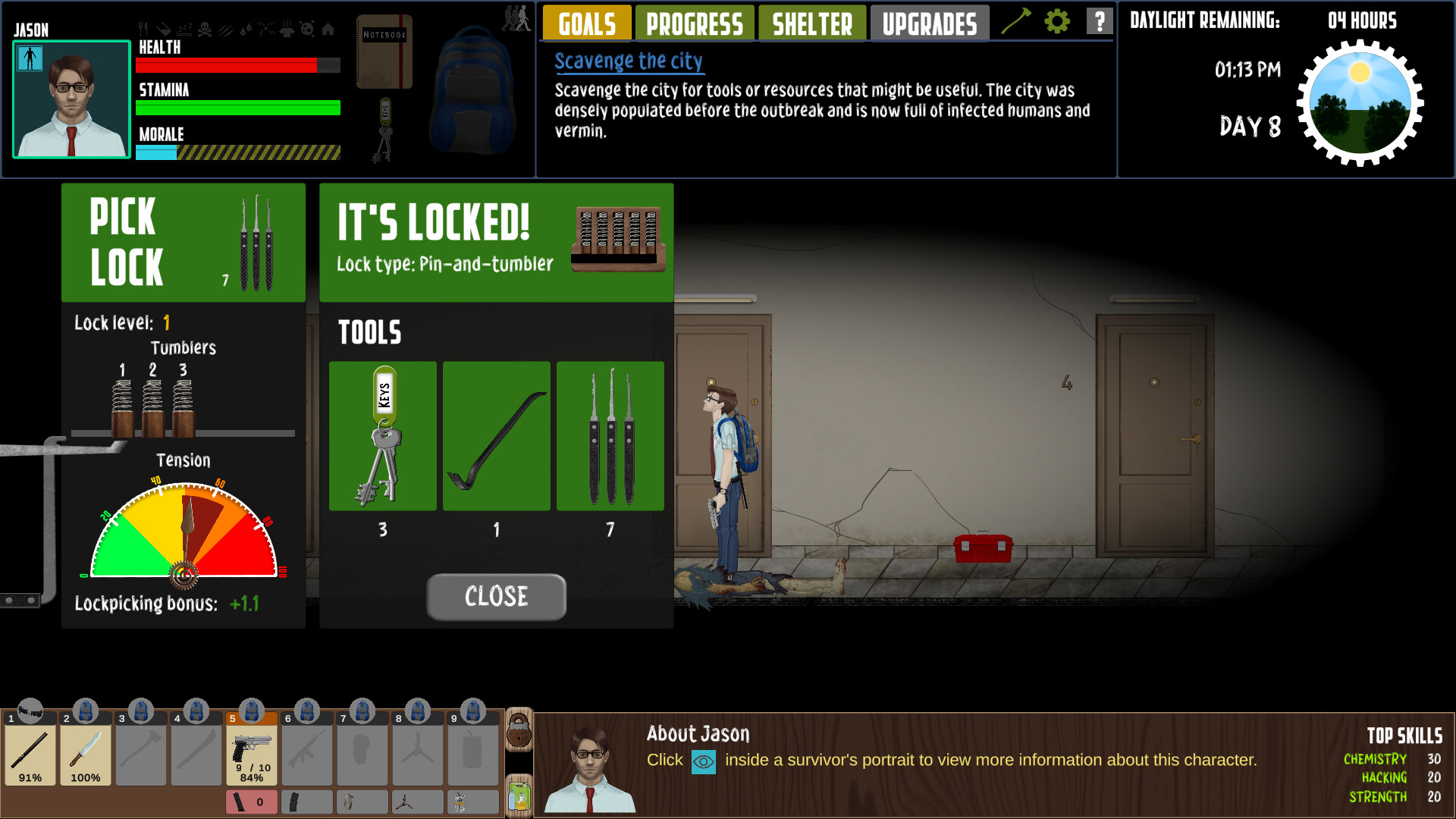 Deal with locks in a number of ways They come in different types and sizes and stand between you and important resources. If you have the right tool in your backpack, you can lockpick, hack or pry open a lock. These actions are implemented as mini-games and the difficulty of the task is affected by the hero’s stats. You can also use a key or enter the right combination, if you found one of these along the way.