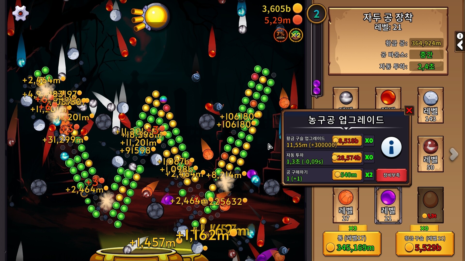 Pegldle은 파친코식 방치형 게임입니다! 보드에 있는 모든 구슬을 없애기 위해 공을 조준해서 쏴 보세요. 황금 구슬을 명중하거나 공을 움직이는 통에 들어가게 하여 황금을 획득해 보세요. 자동 공 투하를 구매하면 공이 보드에 자동적으로 투하될 것입니다. 새로운 공 또는 공 업그레이드에 황금을 사용해 보세요!
