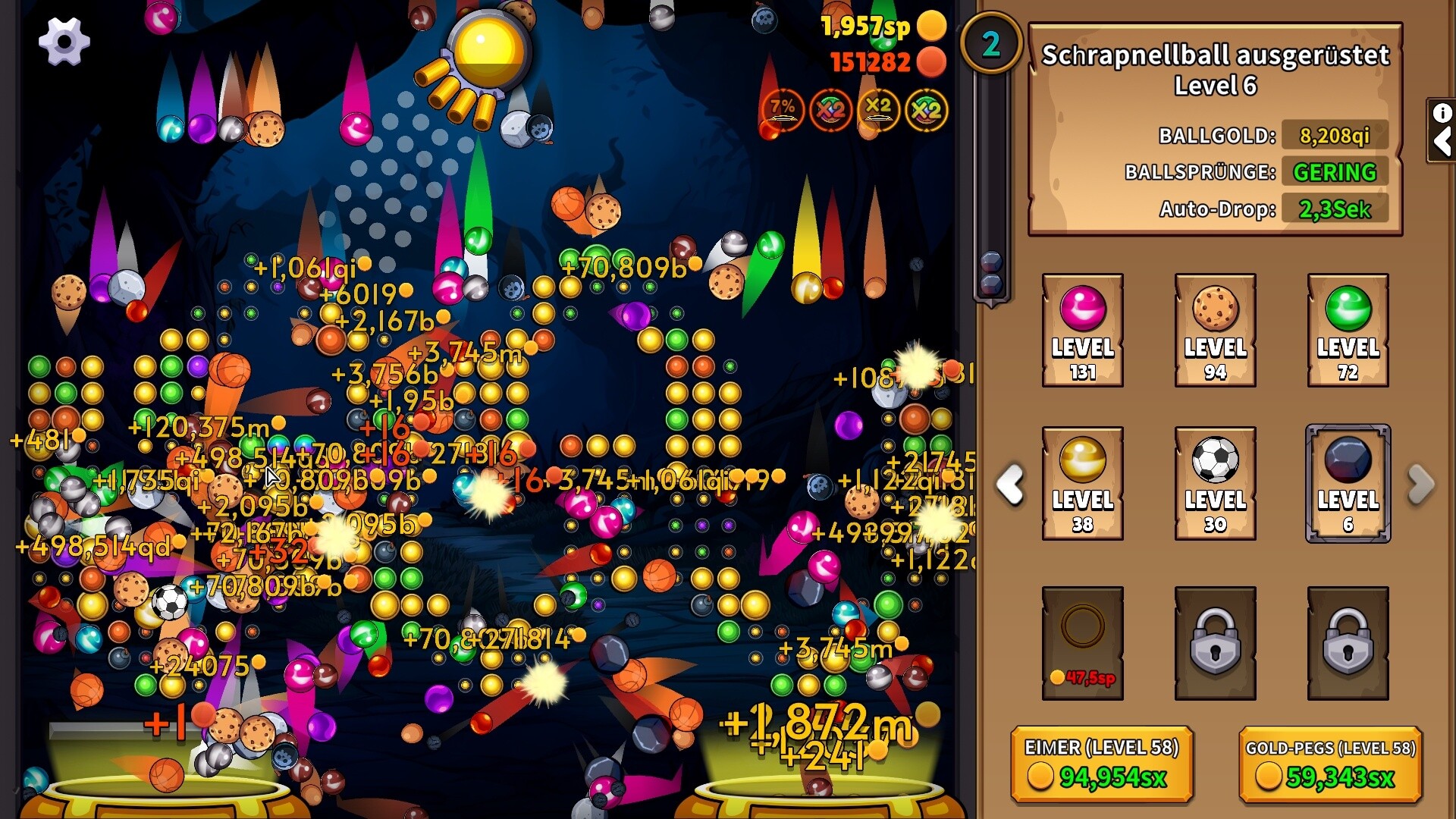 In PegIdle ist dein Ziel, das Spielfeld von Pegs zu befreien. Jedes Mal, wenn ein Spielfeld abgeräumt wird, entsteht ein neues. Jedes Mal, wenn ein neues Spielfeld entsteht, hat jeder Peg die Chance, ein Gold-Peg, ein Prestige-Peg oder ein anderer einzigartiger Peg zu sein. Wenn du Gold-Pegs triffst, erhältst du Gold, das du für neue Bälle und für Ball-Upgrades ausgeben kannst. Gold erhält man auch, indem man Bälle in den sich bewegenden Eimer befördert. Sowohl der Eimer als auch die Gold-Pegs können aufgerüstet werden!