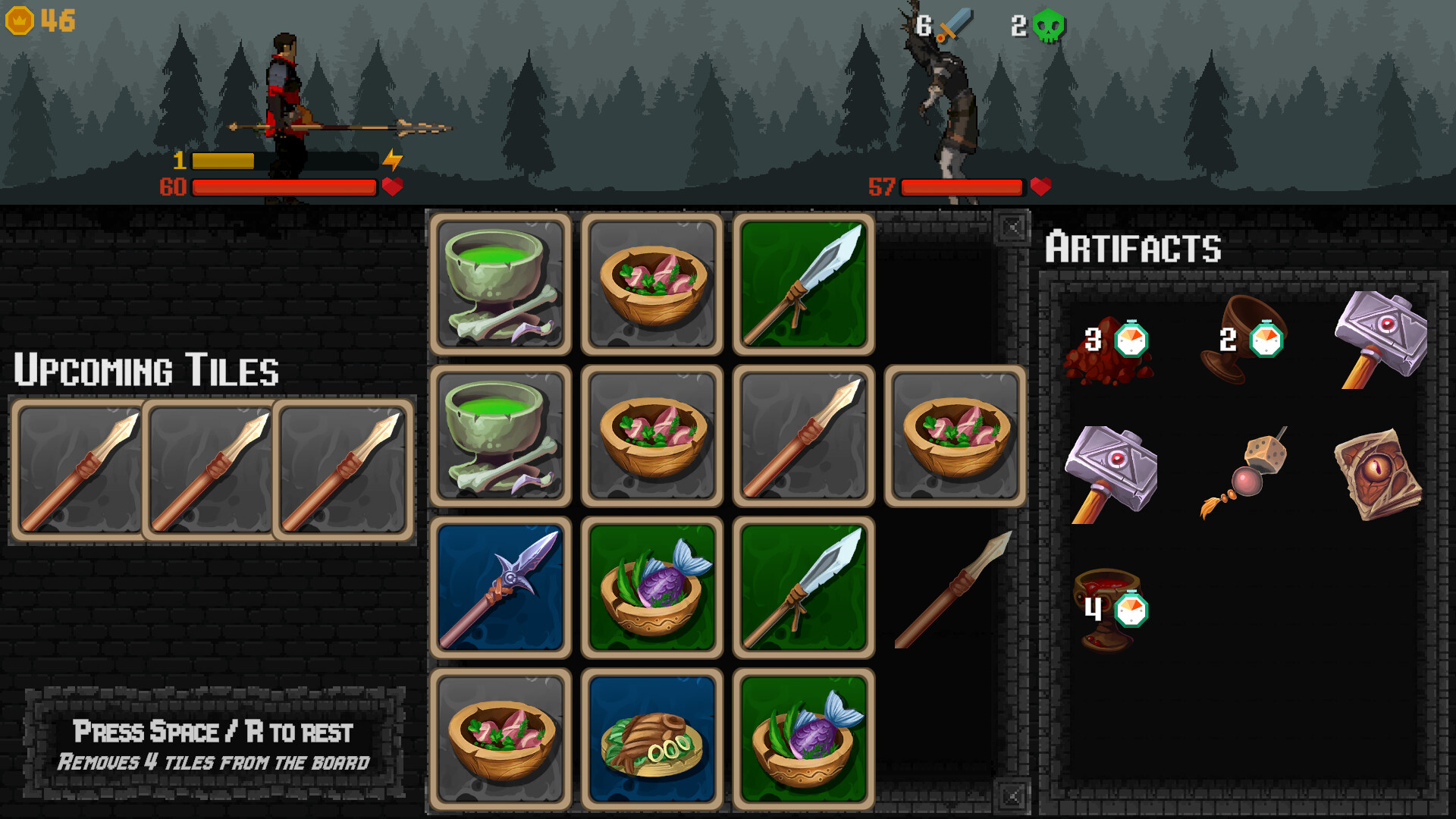 Whenever you push two of the same tiles into one another, they merge into a higher level and activate their effect. This is how you swing your sword, shoot your bow, raise your shield and do much more. As the level of each tile gets higher, its effect becomes increasingly powerful; adding piercing damage, crippling your enemy or removing debuffs from your character. Just take care that your board doesn’t jam up, or you’ll have to take a rest to clear it up.