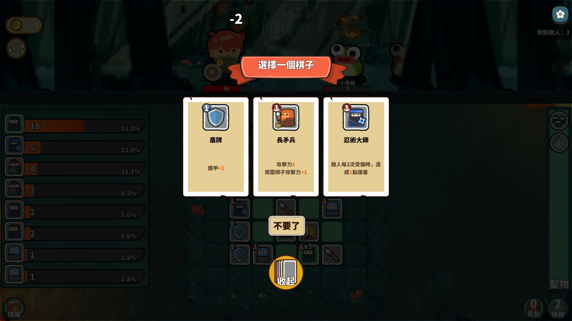 • 三張相同低級棋子相鄰時,會自動合成為高級棋子,打造一支堅不可摧的勁旅吧!