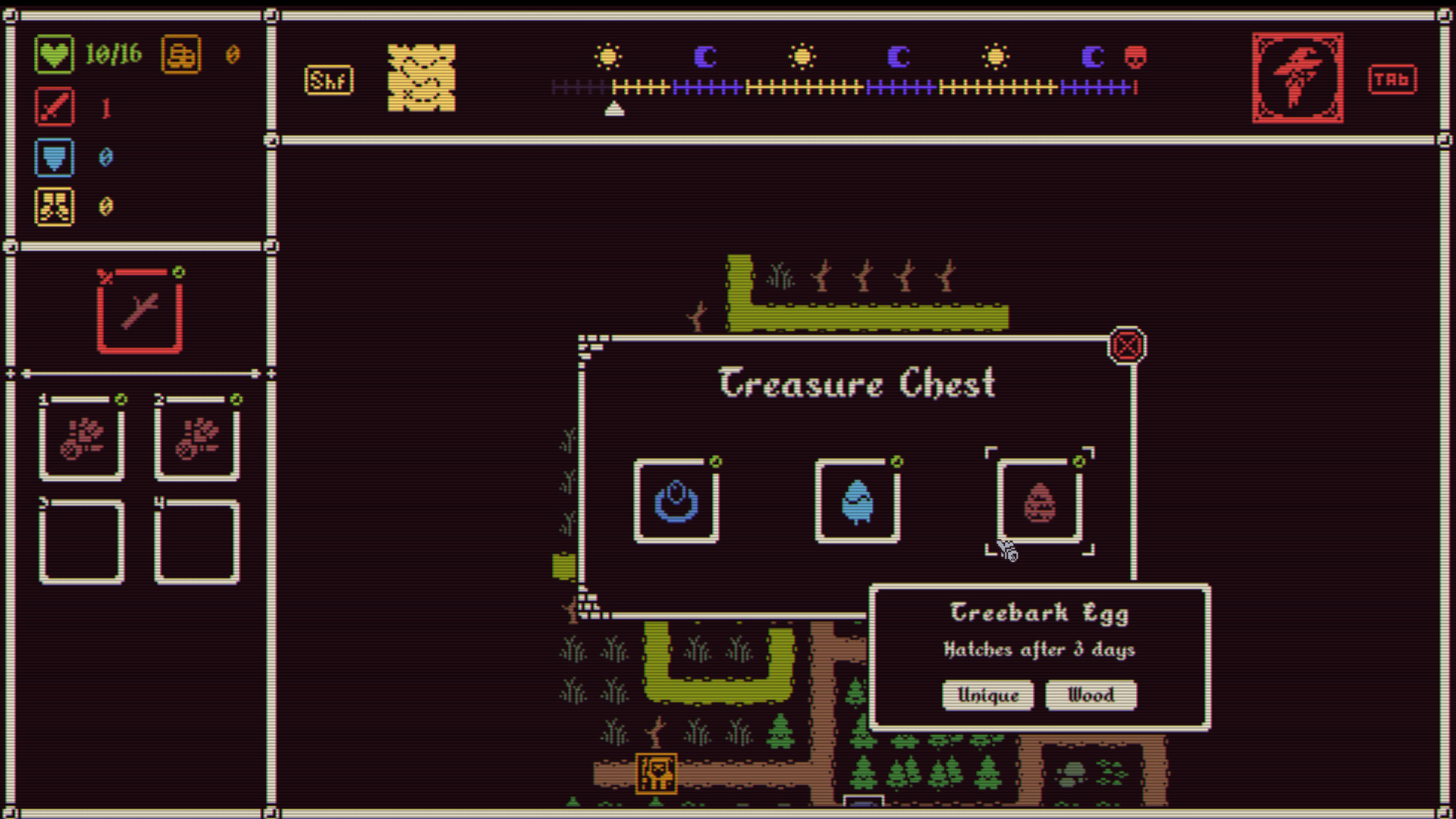 Pursue a multitude of strategies and synergies with over 350 items at your disposal to confront the unique challenge of each monstrous boss. When hunted by the Razorclaw Grizzly, whose fierce attacks ignore all armor, how much armor will you sacrifice for equipment that prioritizes  maximum health, speed, or damage? The lesser monsters stalking the realms will wage a war of attrition against an unarmored hero, and should the Razorclaw Grizzly be slain, three days may not provide enough time to gather enough armor for the next great foe that hunts you. You may, in place of armor, find several items that enhance your speed and attack strength, allowing you to strike first and hard, vanquishing your enemy swiftly – sometimes before it’s able to strike at all. Then, if you luck upon the Saffron Feather, you’d be able to take advantage of your high speed to help regenerate wounds during battle. But should you find yourself hunted by the Black Knight, who absorbs your attack power as his own, high armor becomes a priority over raw attack strength – with the aid of Razor Scales armor to reflect damage back upon your enemy, and enchanted Ruby Earrings to inflict damage every other turn, the Black Knight would face steady damage without raw attack power to absorb for himself. But if you happen upon a powerful magical weapon, do you dare take it up, knowing it will strengthen the Black Knight for the fight ahead, but come to your aid should you survive it?