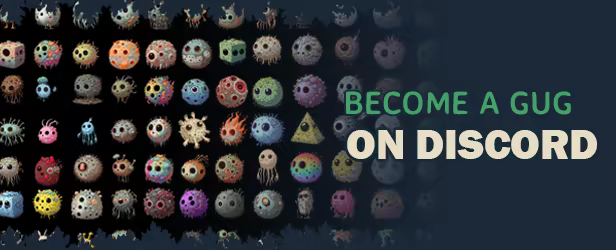 GUG เป็นเกมแนวซิมูเลชั่น sandbox roguelike ที่คุณสามารถสร้างมอนสเตอร์ - "gug" - ได้ด้วยการพิมพ์คำหรือวลีอะไรก็ได้ คำที่คุณเลือกจะเป็นตัวกำหนดรูปร่าง ท่าทาง และวิธีการต่อสู้ของพวกมัน พิมพ์ว่า "กล้วยพ่นไฟ" แล้วคุณอาจได้กักสีเหลืองที่ชอบเผาอะไรไปทั่ว พิมพ์ว่า "เกรมลินผู้ให้กำลังใจทางอารมณ์" แล้วจะได้... ก็ไม่มีใครรู้หรอกว่าออกมาเป็นอะไร!