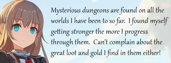 The ever changing dungeons offer Aria a challenge but also grants her great treasures and riches. The floors get progressively more difficult as she goes higher up. The traps also become far more deadly so she must avoid triggering them. The treasures and riches are the reason she keeps going...the higher she goes the better treasures and more gold she finds. She was told that if she went high enough she could even get an audience with the God or Goddess that presides over that world.