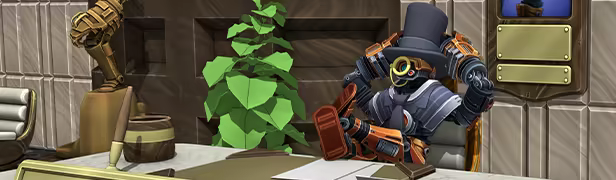 Nothing says “Top Floor” quite like an imposing office desk with matching chairs, filing cabinets and potted plants. Well, nothing apart from a towering statue of your robot exec and an exquisite portrait of your face.