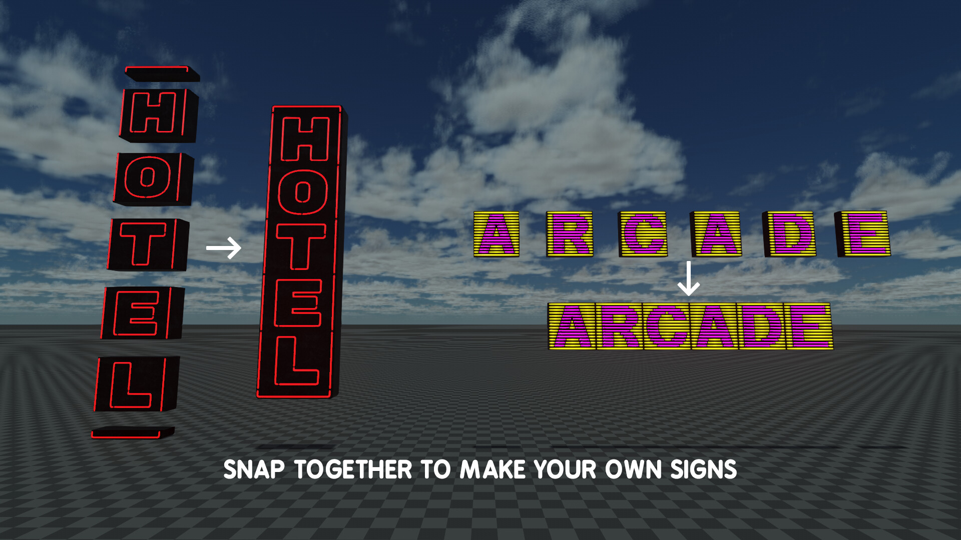 The GameGuru MAX Modern Day Asset Pack - Neon Nights contains 3 complete neon alphabets, along with sets of matching numbers and symbols, totaling over 280 individual assets to add to your games.