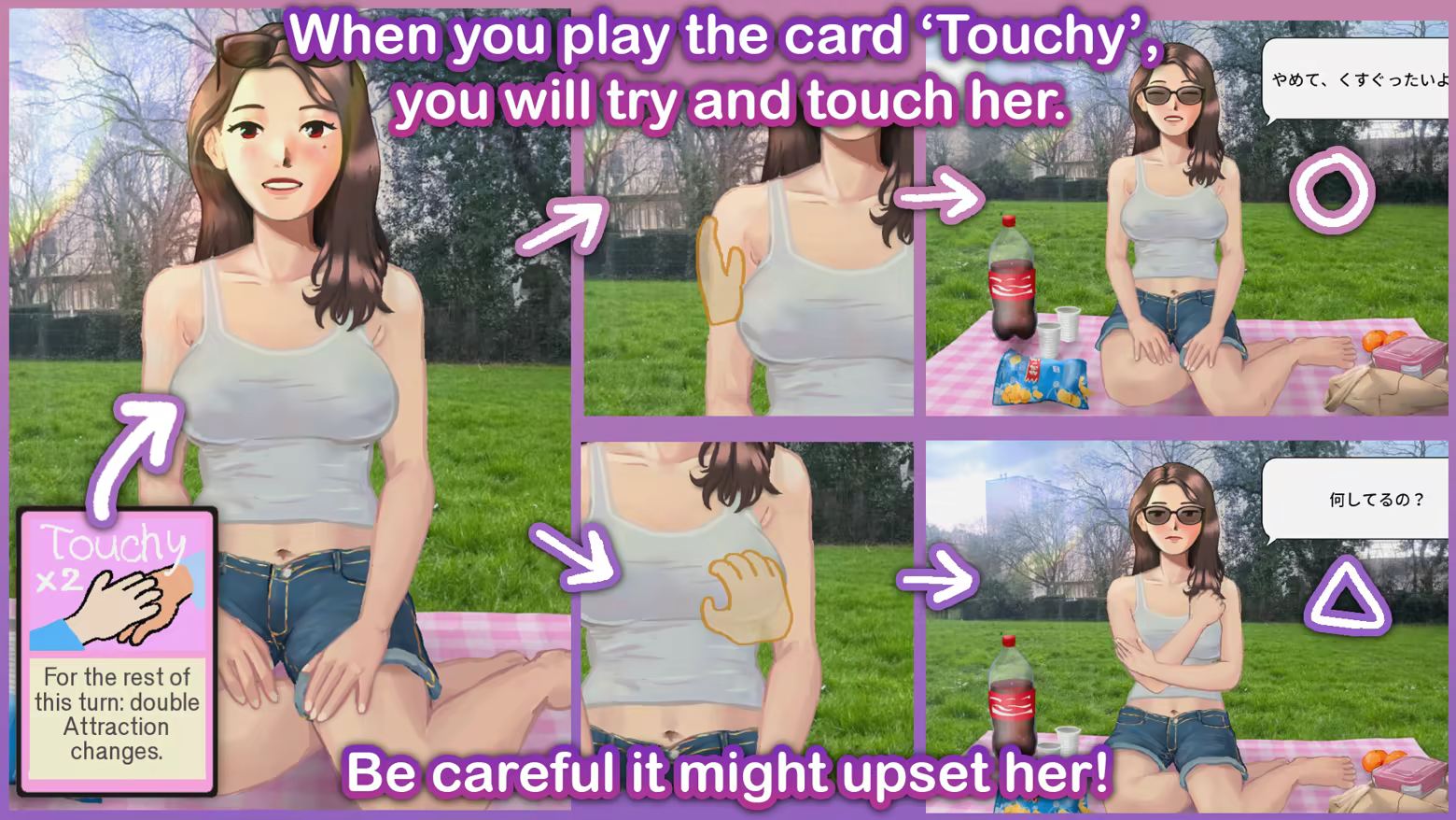 Interact with Joyce by playing cards: When you play a Touchy card, you will try and touch her.