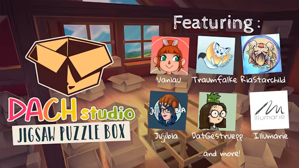 Beautifully drawn artworks from the DACHstudio members for you to puzzle. Multiple difficulties from 16 up to 728 pieces 🧩 for everyone to enjoy.