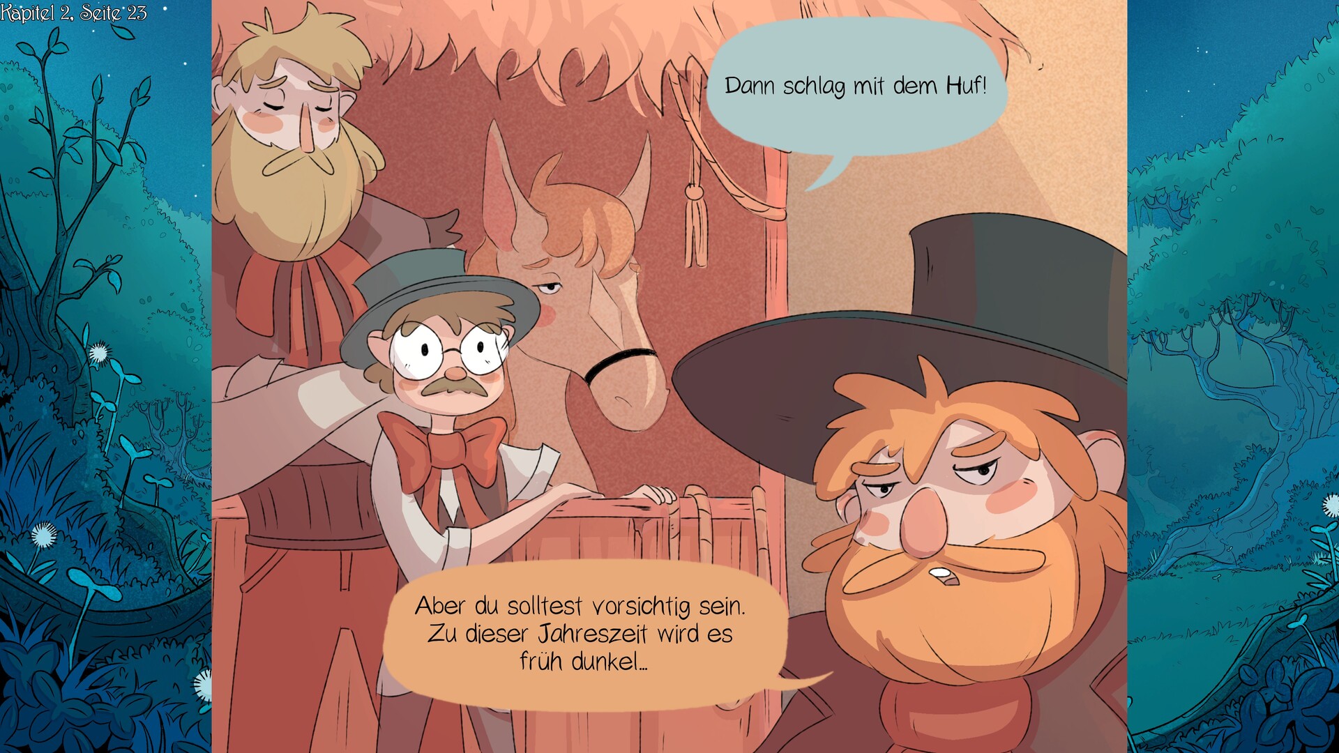 Eine lineare Visual Novel, das uns von den Abenteuern des aufstrebenden Schriftstellers Kosmeya erzählt, der sein Manuskript zu einem Wettbewerb in der Hauptstadt bringen muss, dessen Weg durch einen unheimlichen Wald führt.