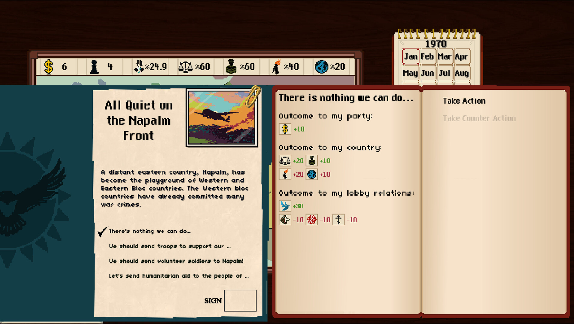 Statecraft is a game that adds humor to political party management. In the atmosphere of the 70s and 80s, shape your country, defeat your opponents, come to power. Fight, stage a coup, make allies. Statecraft invites you to the exciting and corrupt world of politics.