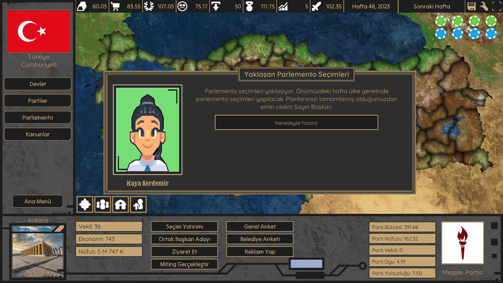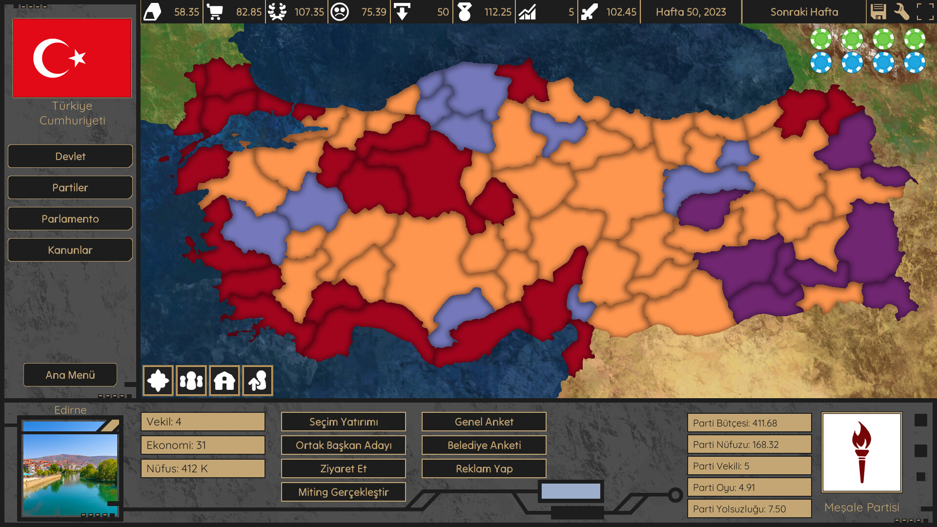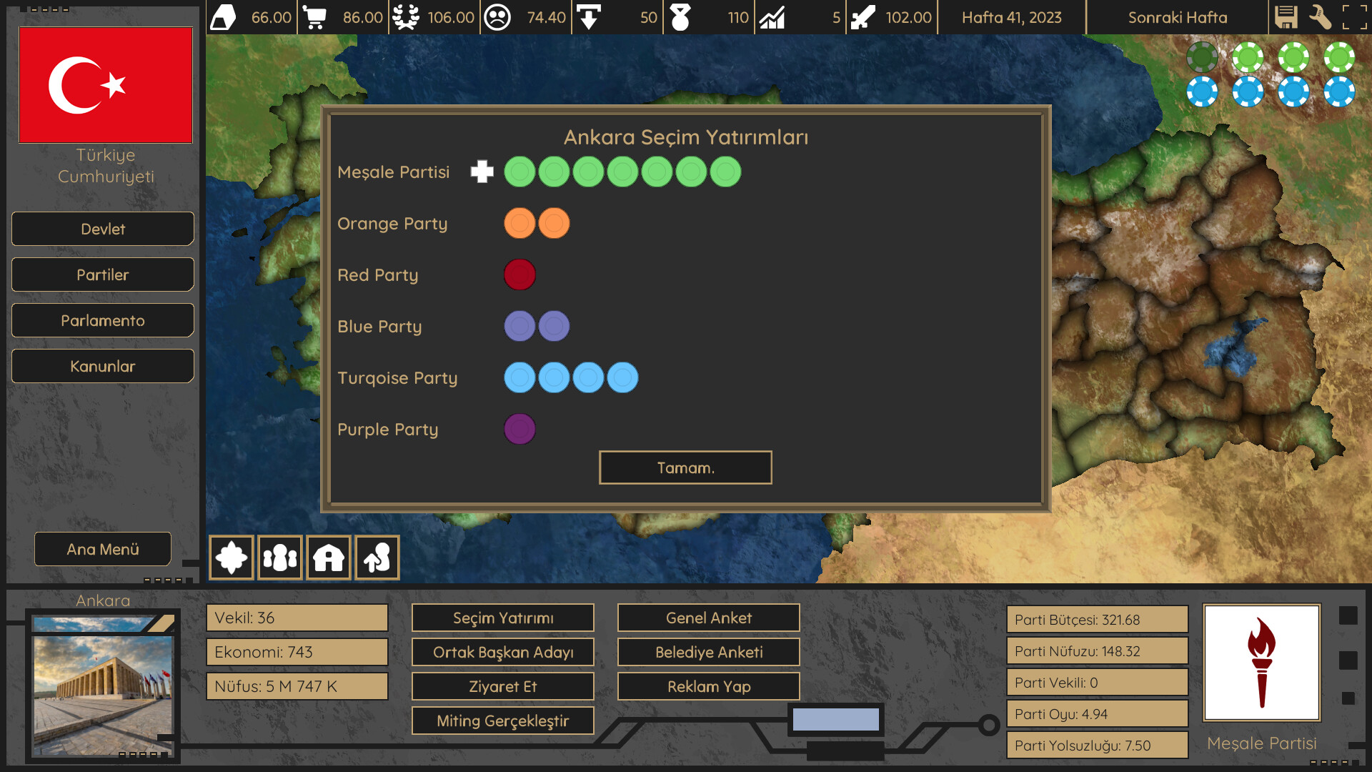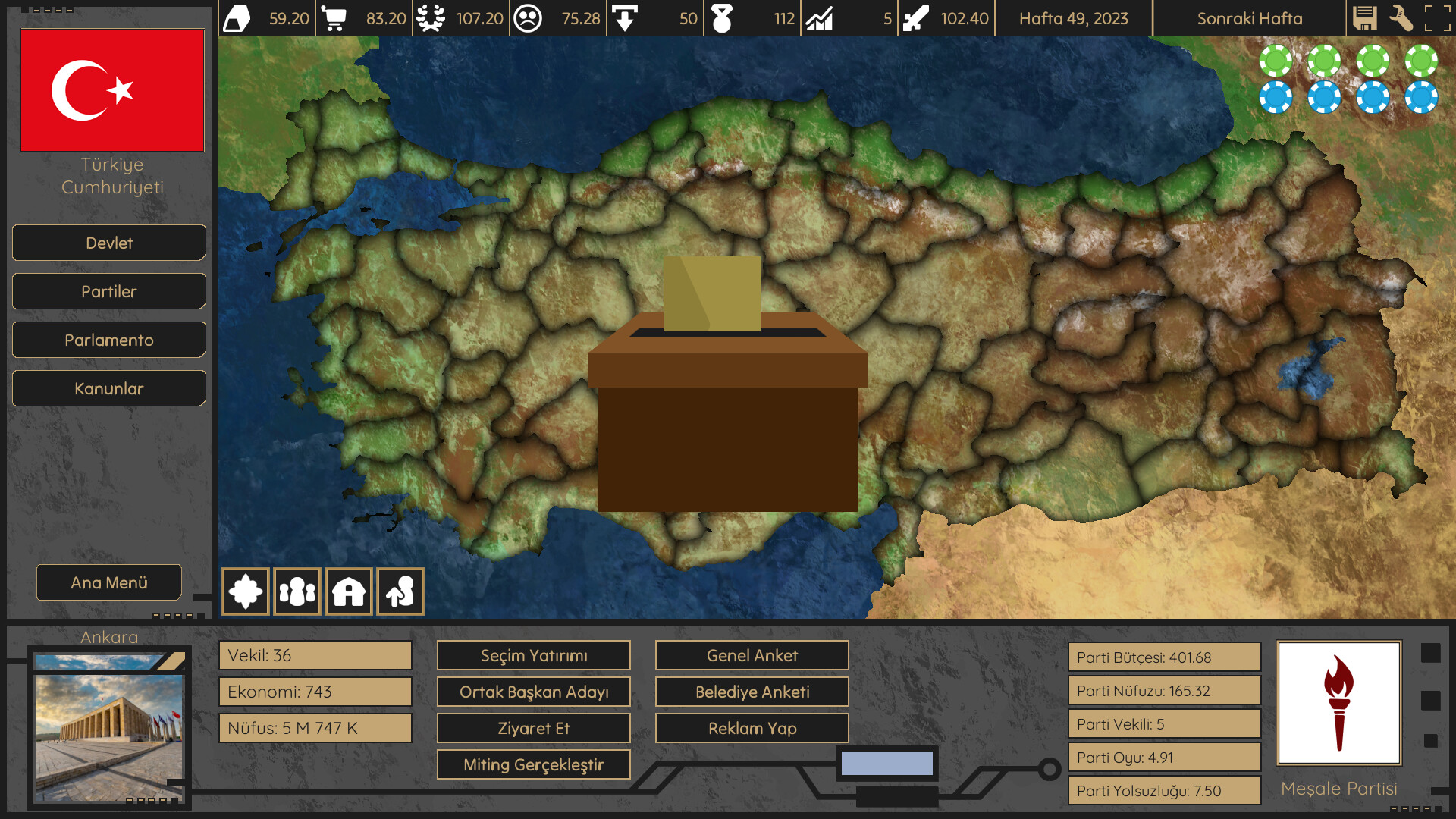 Köklü rakiplerine karşı iktidarı ele geçirmek için kıyasıya bir rekabette siyasi partine liderlik et. Stratejik yatırımlar yap, oyları güvence altına al ve başkanlık koltuğuna oturmak için kritik kararlar ver. Türk siyasetinin kaderini istediğin gibi şekillendirebilecek misin?