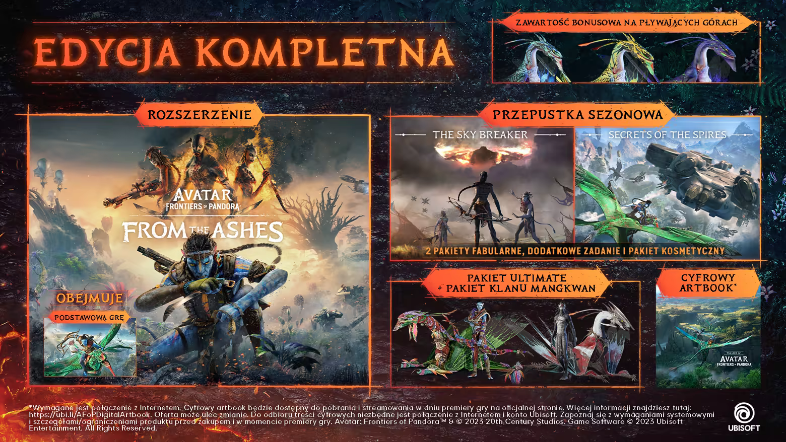 Zawiera podstawową wersję gry, przepustkę sezonową, przedmioty kosmetyczne, zawartość bonusową, cyfrowy artbook i inspirowane filmem Avatar: Ogień i popiół rozszerzenie Z Popiołów.