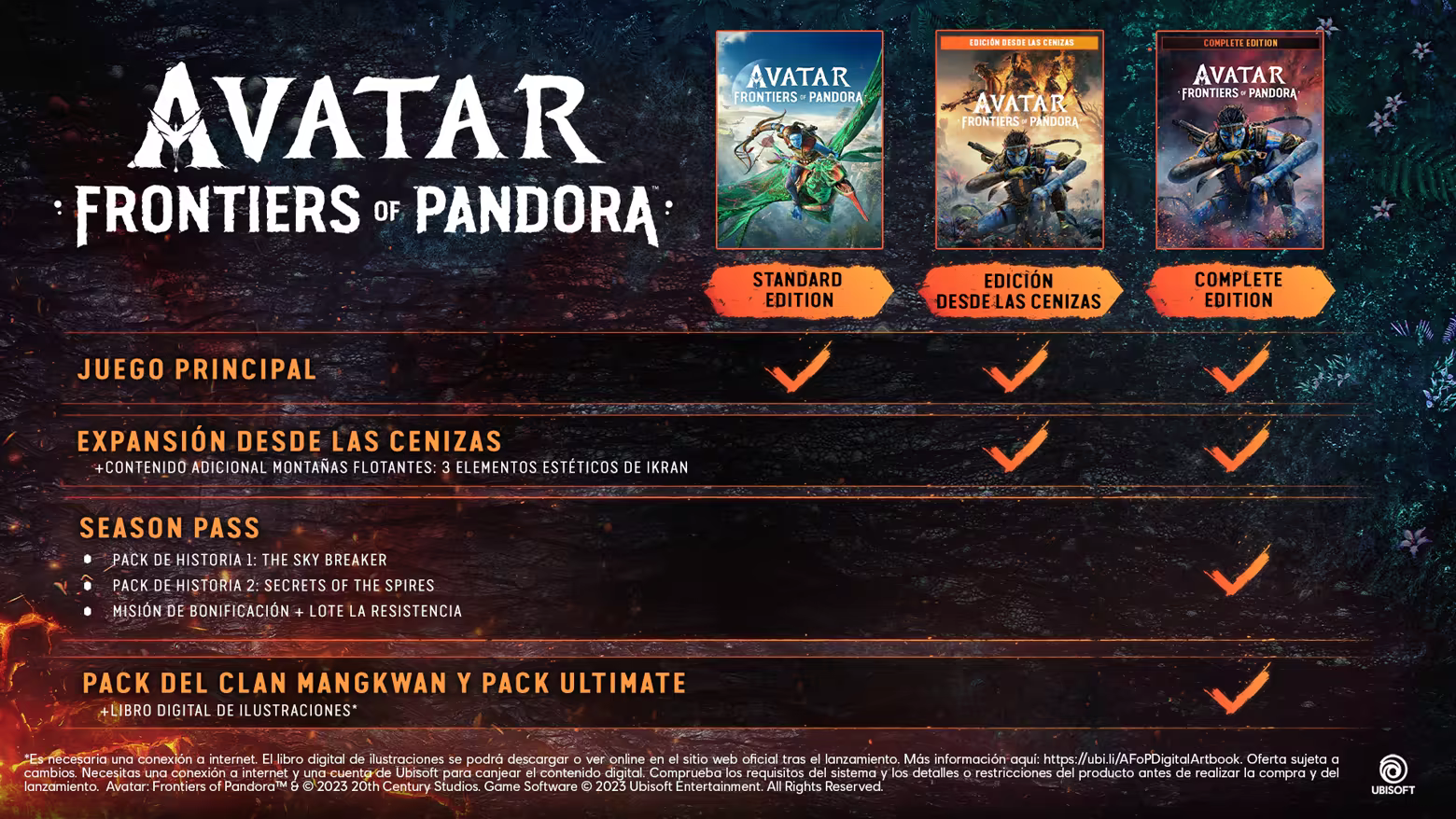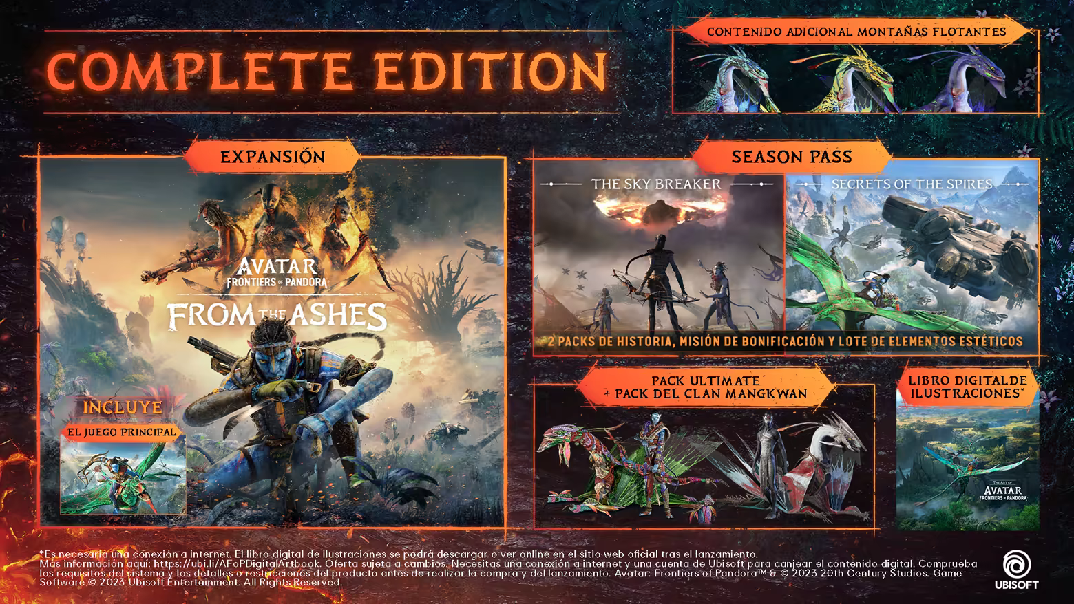 Incluye el juego base, el Season Pass, artículos estéticos, contenido adicional, el libro digital de ilustraciones y la expansión Desde las Cenizas, inspirada en la película Avatar: Fuego y Ceniza.