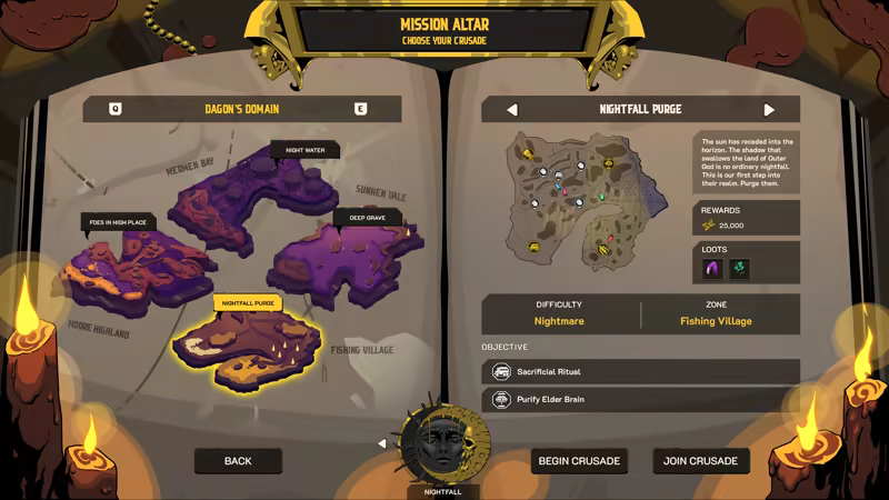 • Purify the Elder Brain: Fortify the ritual site and protect the priests from Outer God’s monstrous army during the rite of cleansing. Your vigilance is crucial to preventing their invasion and strengthening the influence of the Church.