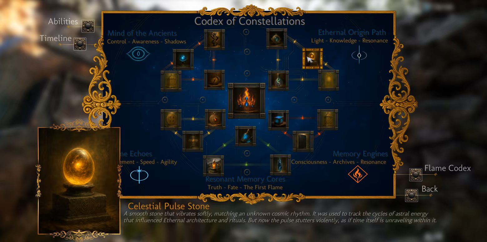 Each discovery reveals fragments of lost history, deepens Resonance, and opens new paths forward — hinting at a larger pattern tied to the Ethernal Flame.