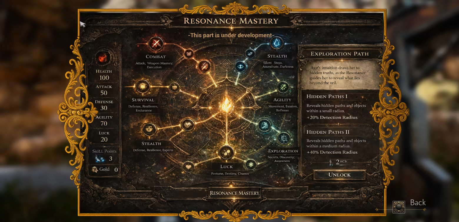 Ava’s bond with the relics deepens through Resonance Mastery — an evolving ability system shaped by the forces she awakens. New powers, passive traits, and subtle upgrades emerge as Ava resonates more deeply with the ruins — and as the world begins to respond in kind.