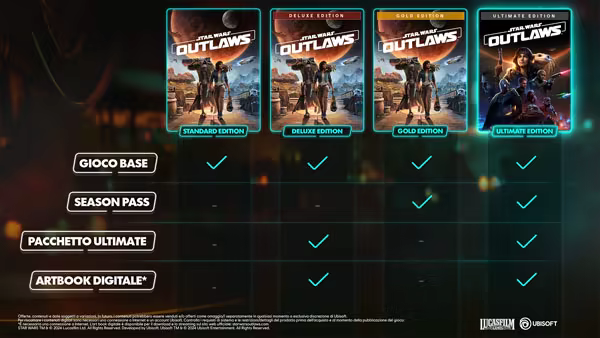 Con la Gold Edition di Star Wars Outlaws, ottieni accesso al gioco base e al Season Pass che include:
